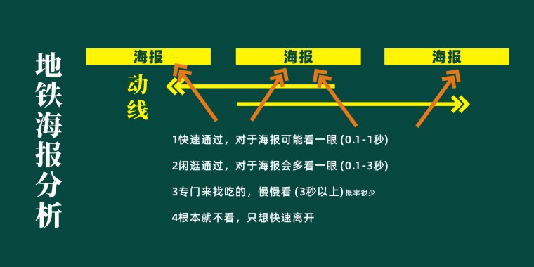 通過在地鐵站現場觀察,品深發現蘩樓的地鐵海報位置單面靠墻,閱讀動線是沿著墻的路徑左右行走,目標是向前方換乘或出站,由于客流密集,路過此處的人完全無法停下來,看到海報的大部分的機會是眼睛的余光一掃而過,邊走邊看。