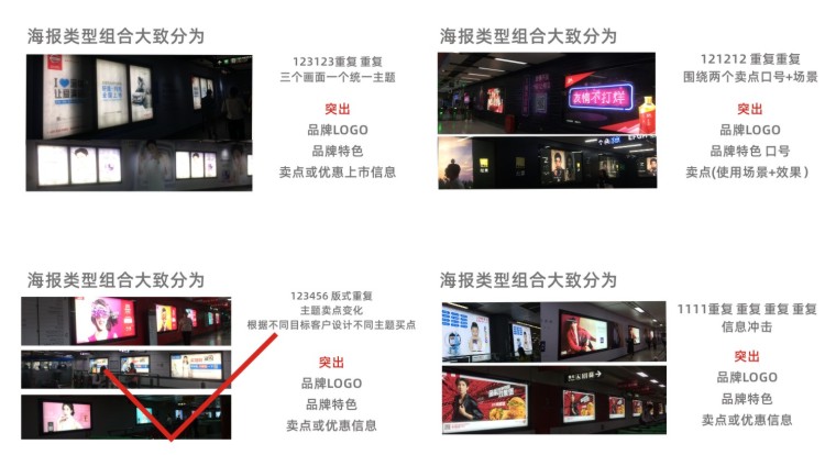 我們選取了(周末時間+上班時間)兩天,對深圳客流密集的多個地鐵中轉站點,和幾個特定時間段。進行現場蹲點觀察,并拍攝了目前1000多張地鐵站現存的海報圖片實例。通過對海報圖片的分類整理,地鐵站客流對廣告關注度點的觀察。最終團隊投票選取出印象最深且能傳達品牌信息的多張地鐵站品牌海報進行廣告傳播原理及設計原理逆向推理分析: