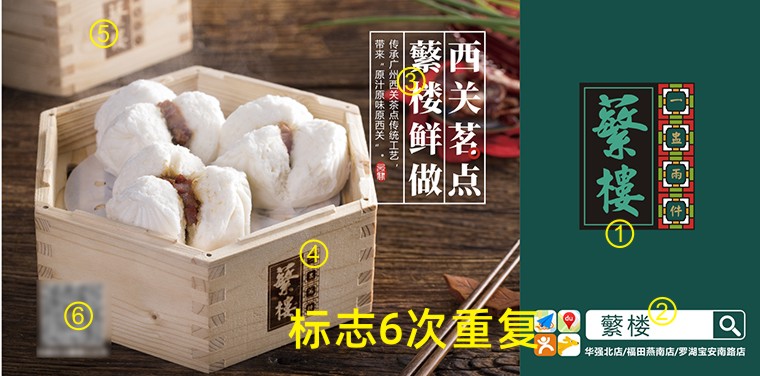 a 畫面重復三次以上出現“蘩樓”logo信息:由于顧客是路過,而且離畫面很近,所以眼光掃射之處并不是全部看見海報的,而是海報的某一個角落或一個點一個面的形式組合。因此畫面中我們從廣告語“西關茗點,蘩樓鮮做”+蘩樓logo+搜索框“蘩樓”+蒸籠上“蘩樓”,在一個畫面中多次刻意出現蘩樓品牌logo。