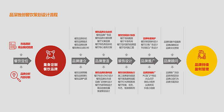 好的餐飲設計公司非常關注品牌的落地執行。餐飲品牌構建好了,門店運營起來了,品牌的營銷推廣才開始。一個餐飲品牌的成功,是方方面面相得益章的結合。好的戰略需要團隊的執行,好的方案需要團隊的執行。執行效果的好壞在于企業管理體系是否合理,團隊建設是否合理。無論是營銷全案策劃、品牌全案策劃、廣告全案策劃、公關全案策劃,都只是企業經營活動的一部分,而企業無論哪一部分的成功,都不可能使企業長久的成功。品牌的營銷推廣需要整合起來,形成常年累月,持之以恒的品牌推廣運營策略,不斷提升企業的品牌知名度和品牌影響力。好的餐飲設計公司可以助力你搶占心智,讓消費第一就想到你,品牌的價值就實現了。