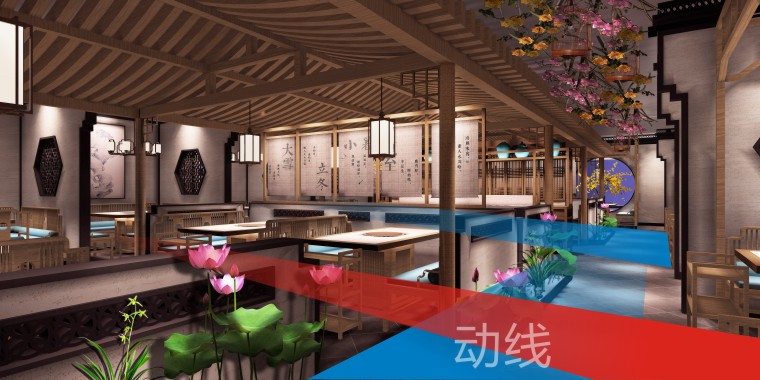 動線:是建筑與室內設計的用語之一,把人在室內外移動的點連起來,就稱之為動線。餐廳動線是指顧客、服務員、食品與器皿在餐廳內流動的方向和路線。如:后廚動線,必須以高效、安全為原則,既要考慮各個功能點設置是否合理,同時也要讓廚師操作最短,避免交叉,目的是更快捷出餐,方便顧客用餐,提升翻臺率。好的餐廳動線設計可以增加員工工作效率,提升上菜速度,給顧客良好的用餐體驗。