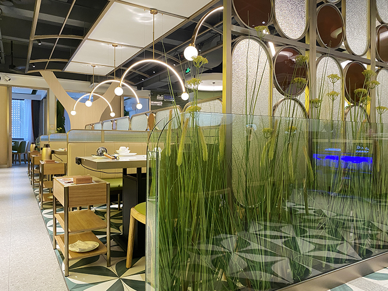 我們想到了磨砂玻璃這一材質(zhì),在餐廳立面的隔斷、包間的墻體,我們使用了磨砂玻璃及玻璃方磚,這種材料在燈光照耀下,有一種晶瑩剔透的感覺,用裝飾材料特性表現(xiàn)菜品清湯這一核心特征,打造出時尚清新,通透舒適的空間感受。