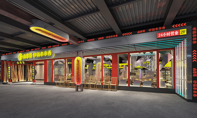 1、鹵串哥砂鍋串串香首次進(jìn)入深圳市場,如何通過空間裝飾裝修設(shè)計(jì)的用餐體驗(yàn)環(huán)境來表現(xiàn)串串香火鍋與其他火鍋、其他餐飲品類不同的市井氣,煙火氣?