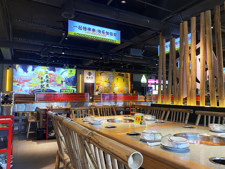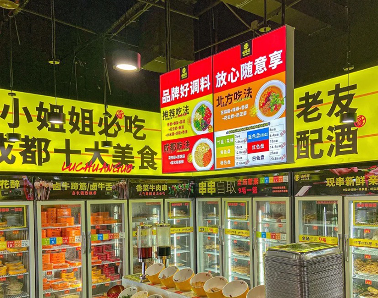 串串香火鍋的用餐特點(diǎn)比較獨(dú)特,類似自助火鍋。顧客自己到冰柜取串串,拿飲品,喜歡什么就拿什么。因此,在門店功能設(shè)計(jì)方面,取串串的冰柜是客流最密集的地方,需要給顧客展示出串串品類特別多的優(yōu)勢。