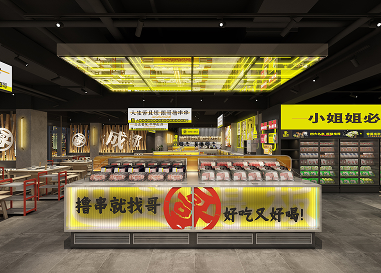 品深將其設(shè)計(jì)出連續(xù)長排展示,讓顧客有一種想征服美食的欲望。鹵串哥堅(jiān)持的是串串每日新鮮現(xiàn)串,這是鹵串哥菜品的顯著特點(diǎn),我們將其設(shè)計(jì)成明檔,命名為:串串吃法研修堂。讓顧客對新鮮能親眼所見。